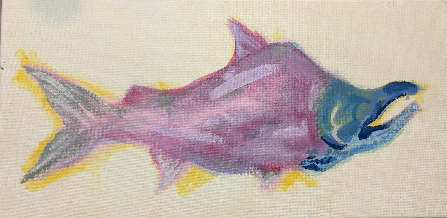 Sockeye is an acrylic painting on canvas. It was one of my first times experimenting with acrylic paints, and my main goal was to create a pastel piece with intentional brushstrokes. Full process breakdown images below.